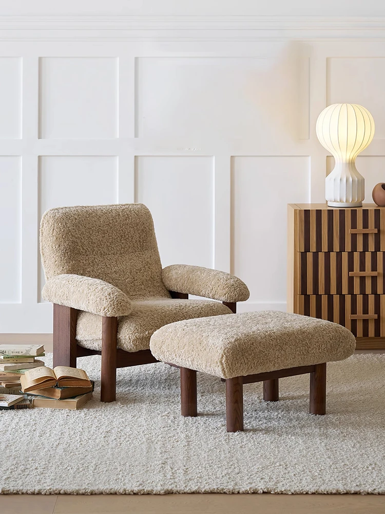 French Retro Solid Wood Armchair - Brasília Style Cream-Colored Lambswool Single Sofa Chair for Cozy Living Spaces