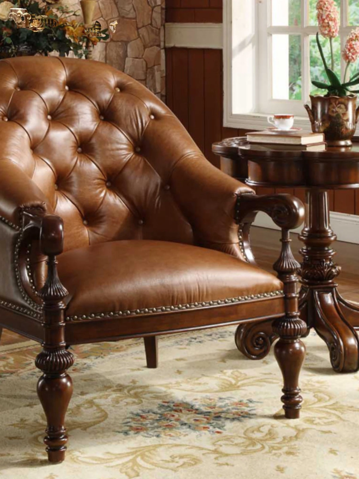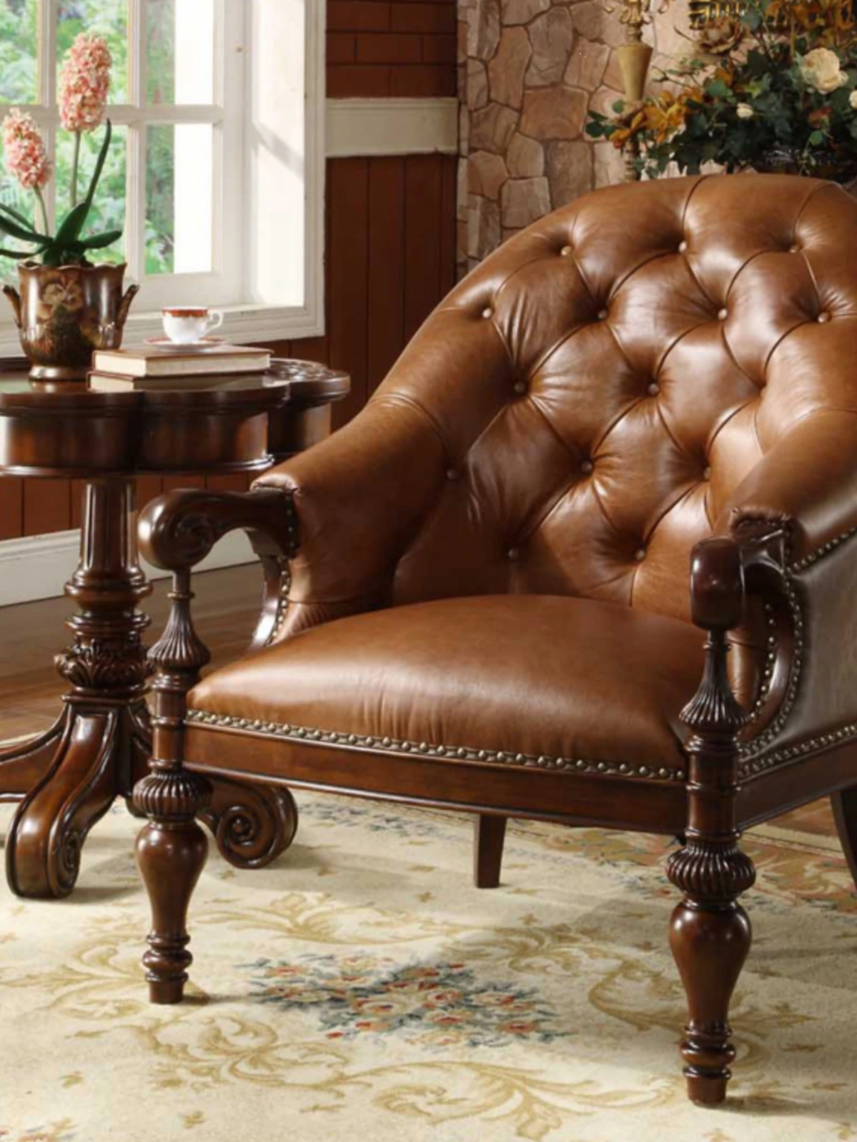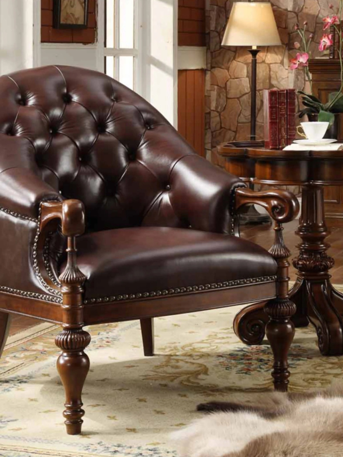 Premium American Solid Wood Leather Tiger Chair - Vintage Style Single Sofa for Bedroom and Living Room, Elegant and Luxurious Design, Perfect for Relaxation