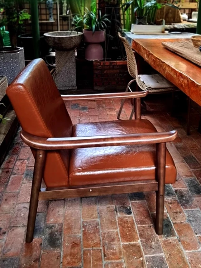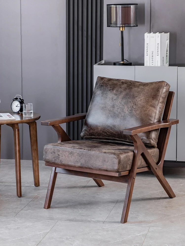 北欧スタイルの無垢材一人掛け椅子 - シンプルでおしゃれな書斎やバルコニーにぴったり!レトロなデザインの和風ソファ、快適な背もたれ付きでリラックスできる一人用チェア。