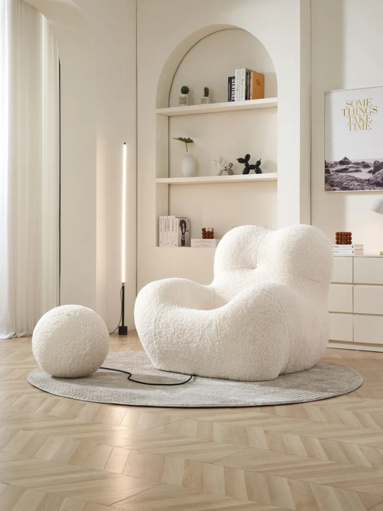 ママの優しい抱擁、人気のクリーム風ラウンジソファ!ふわふわのラムウール素材で作られた一人掛けデザイナーチェア。リラックスできる居心地の良さをお届けします。おしゃれなリビングにぴったり!